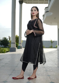 Elevate your style with this luxurious black 3-piece set, crafted from delicate organza fabric. The shirt features exquisite embroidery that adds a sophisticated touch, while the matching inner, trouser, and dupatta complete the ensemble. The dupatta, in particular, enhances the look with its graceful flow and elegant design. Perfect for special occasions, this outfit seamlessly blends beauty, comfort, and class, offering a refined yet timeless appeal.